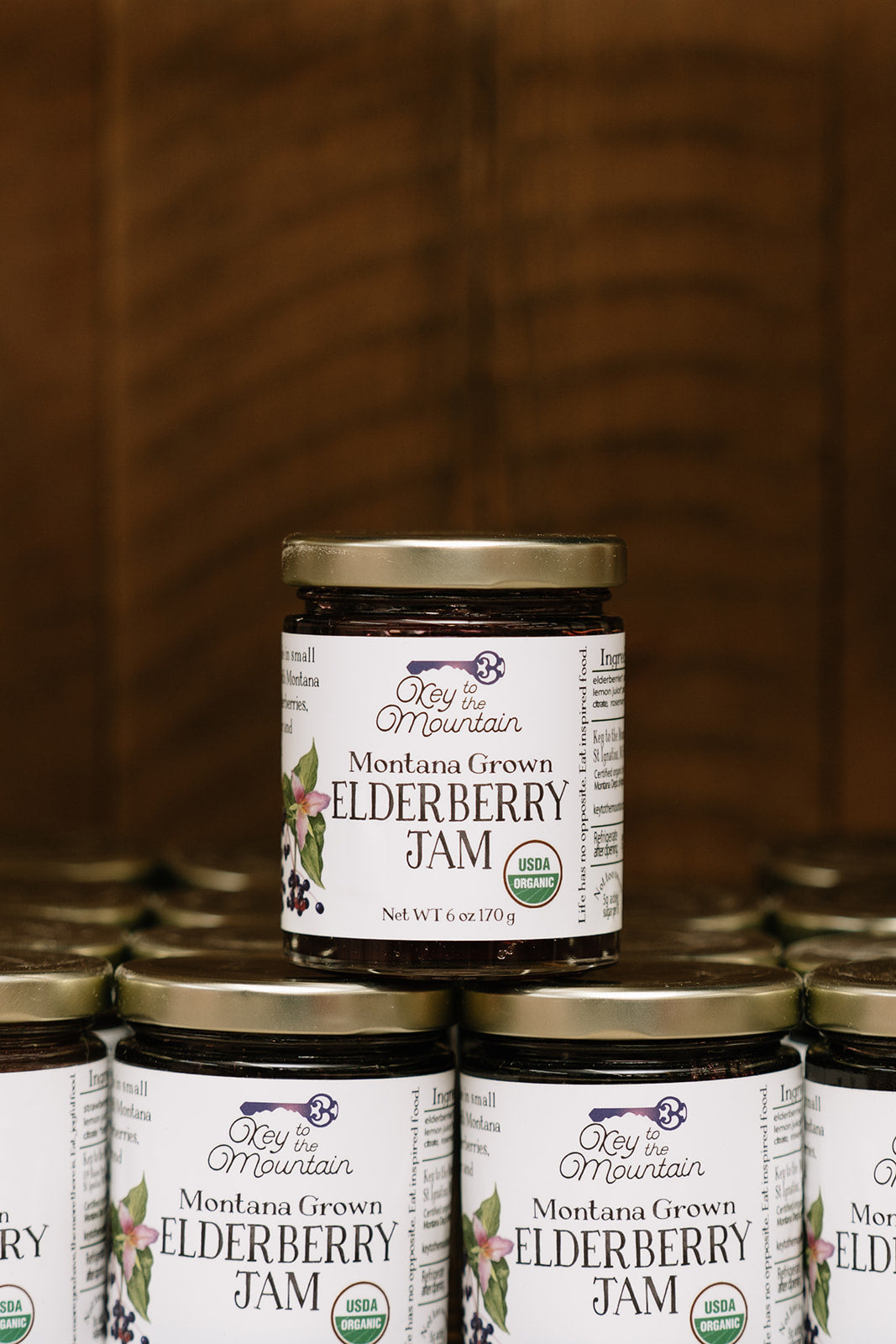 • Elderberry Jam - whole elderberries harvested from the Flathead Lake region in Montana make for a delicious one-of-a-kind jam. Balanced with a hint of rosemary. Ingredients: organic elderberries, organic cane sugar, organic lemon juice, pectin, calcium citrate, organic rosemary leaf
