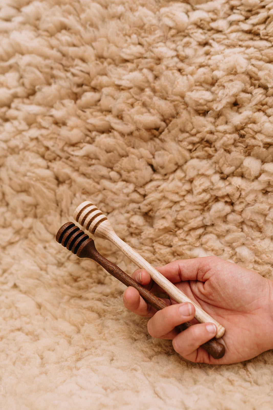 Individually hand-turned from local hardwoods in our own design. A little longer of a handle and slightly smaller head than what is typically seen. Finished with our food-grade Spoon Butter, for a long-lasting, durable finish. Approx. 7 inches long