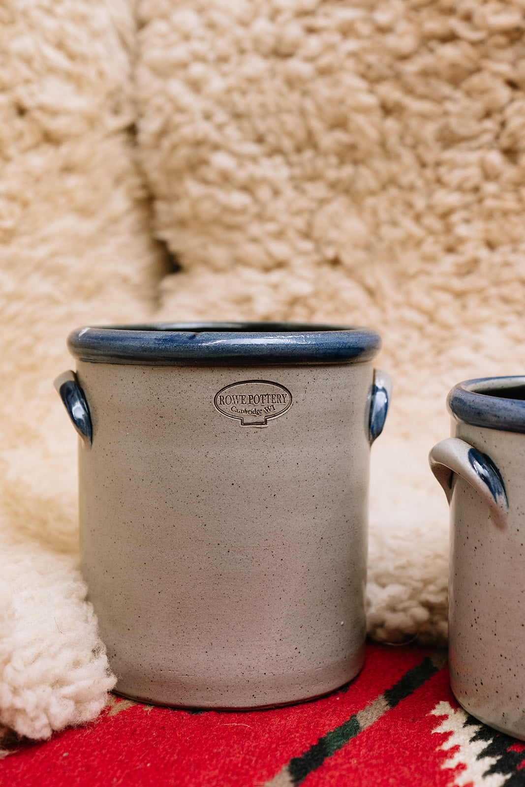 Simply Rowe 1/2 Gallon Crock and 1 Gallon Crook is ideal for the desktop or kitchen counter. The Simply Rowe collection is the perfect starter collection and blends beautifully with our other Rowe Pottery creations. With a crisp, classic logo impression and simple blue decoration in our classic blue and gray salt glaze, it’s a must for any Rowe Pottery lover. Distinctive black interior glazing gives it a stately approach. It’s the perfect gift or addition to your collection. All Rowe Pottery is handcrafted by our artisans in Cambridge, Wisconsin.
