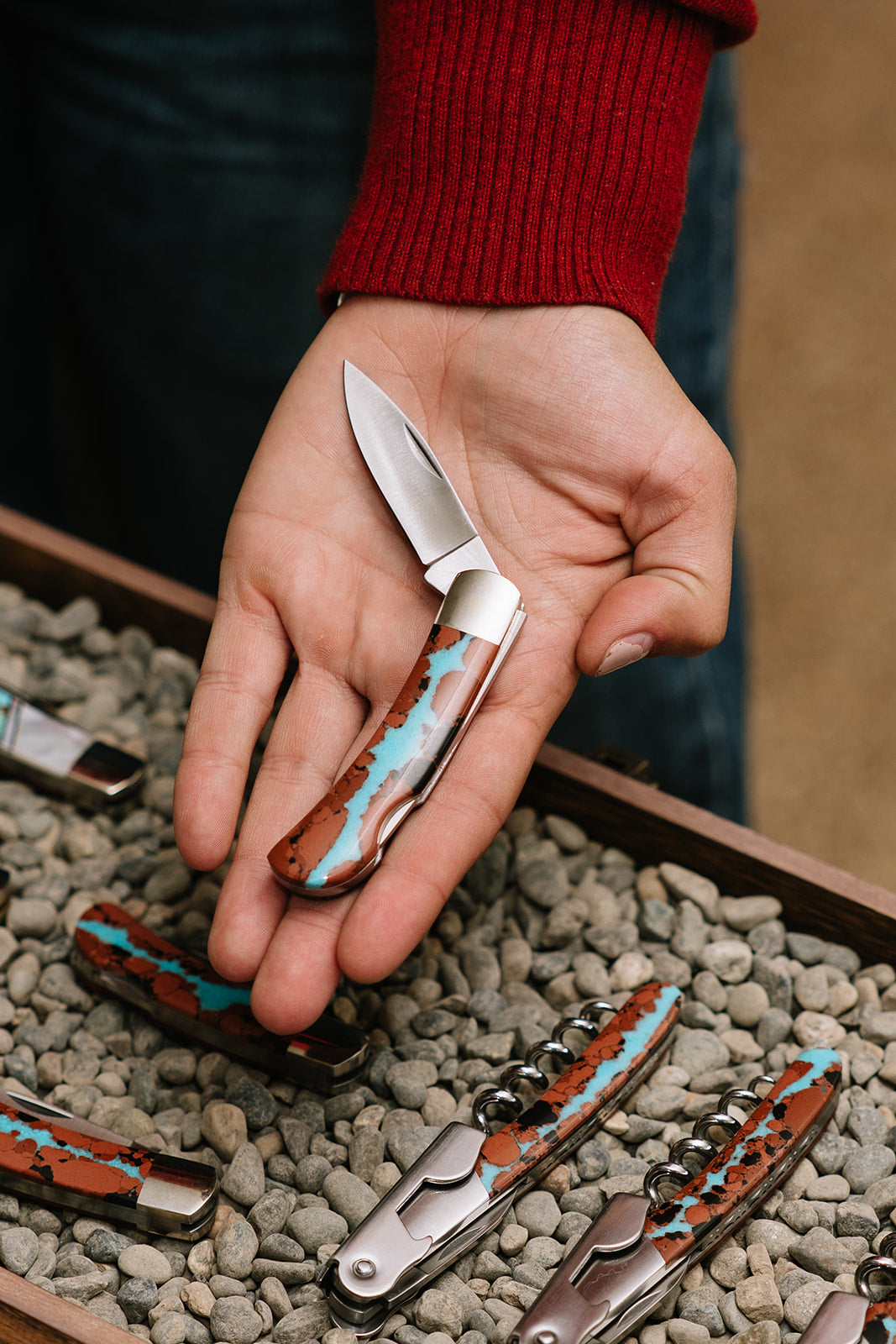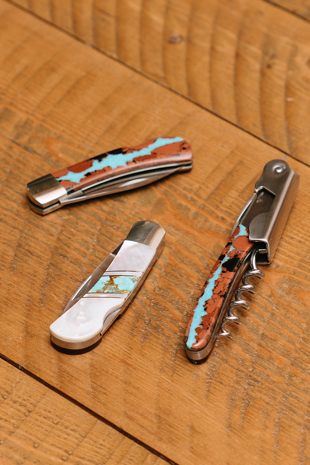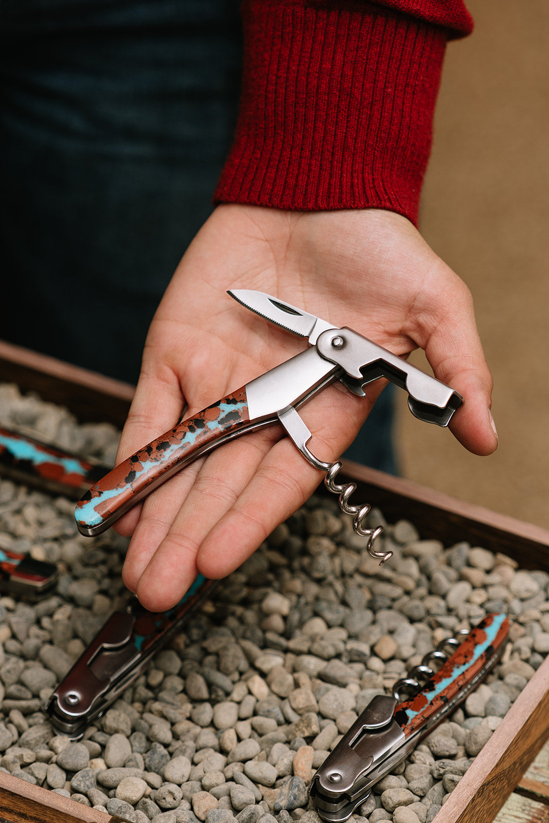 Vein Turquoise Collection Waiter's Knife: This Vein Turquoise is a unique new presentation for Santa Fe Stoneworks pocket knives & table cutlery. This Waiter's knife features solid steel construction and all the tools that your wine connoisseur wants - corkscrew, foil cutter and integrated bottle opener, dressed up in our exclusive Vein Turquoise inlay. The perfect housewarming gift, or bring it to your next holiday party to dress up the festivities!