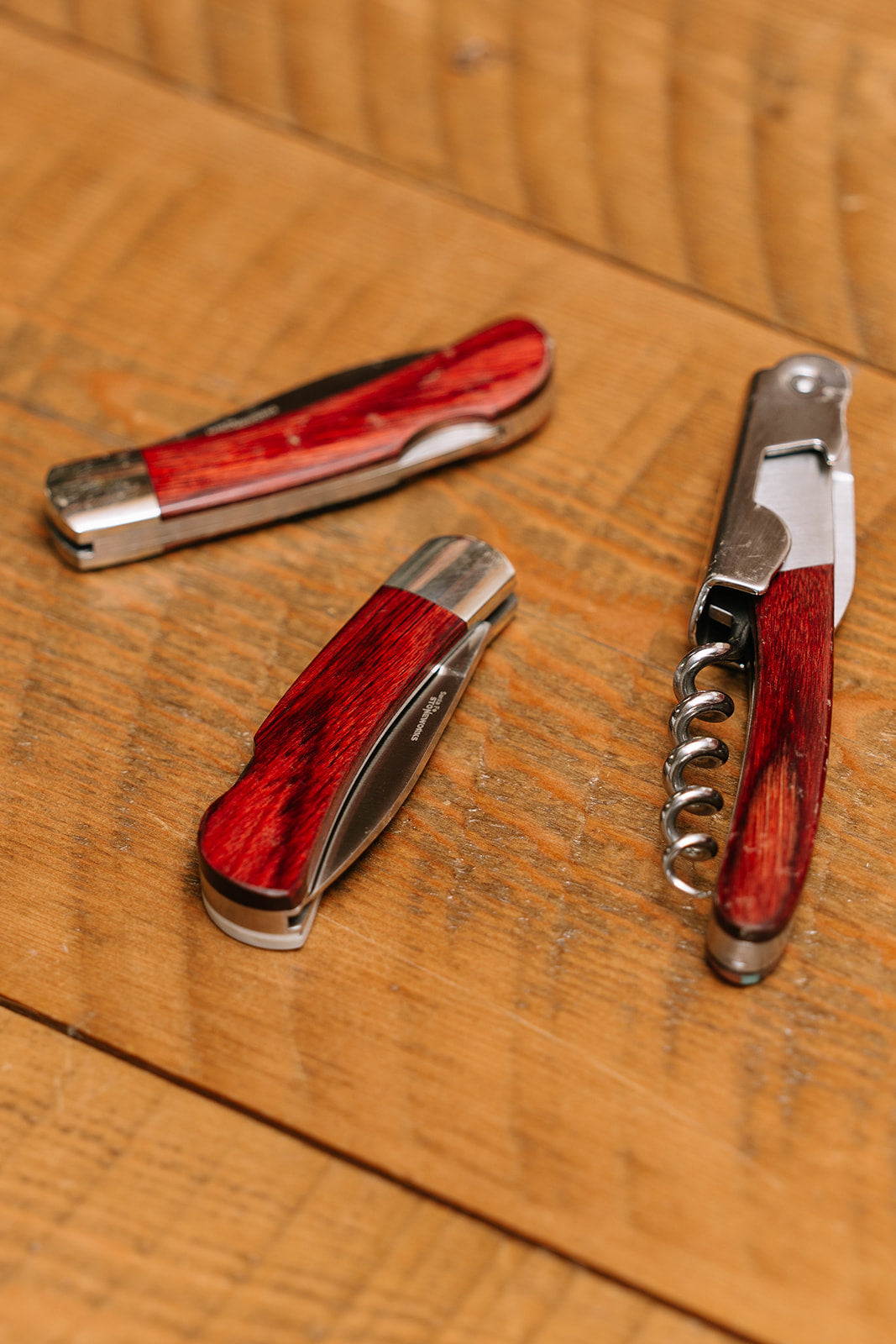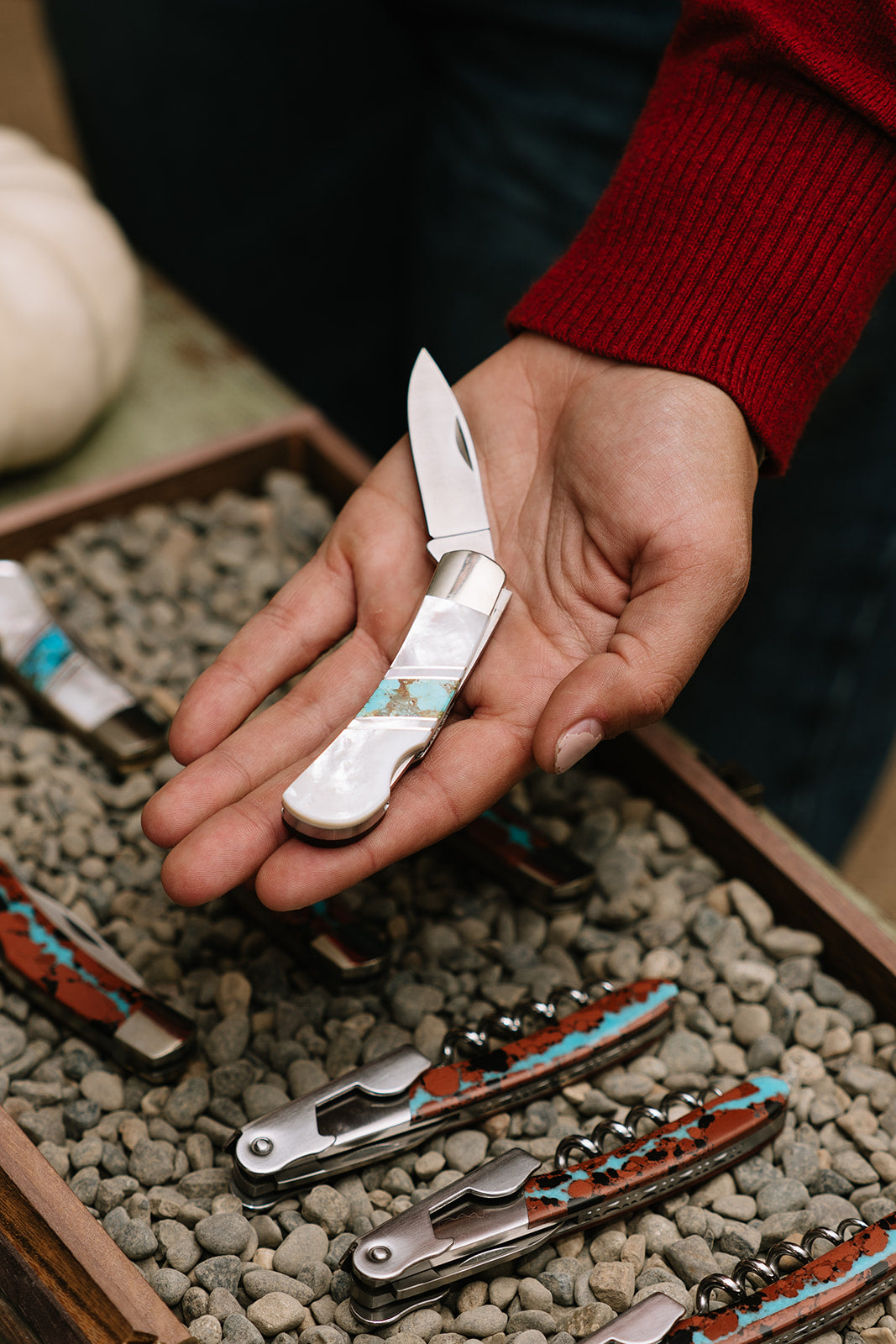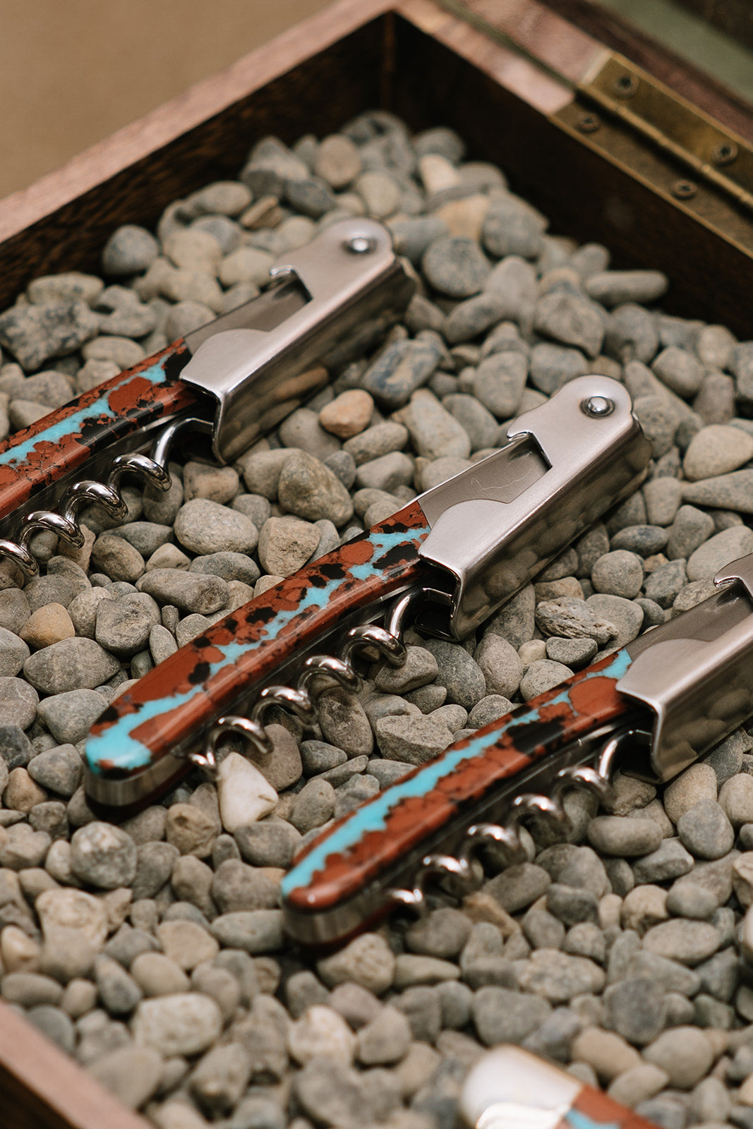 Vein Turquoise Collection Waiter's Knife: This Vein Turquoise is a unique new presentation for Santa Fe Stoneworks pocket knives & table cutlery. This Waiter's knife features solid steel construction and all the tools that your wine connoisseur wants - corkscrew, foil cutter and integrated bottle opener, dressed up in our exclusive Vein Turquoise inlay. The perfect housewarming gift, or bring it to your next holiday party to dress up the festivities!