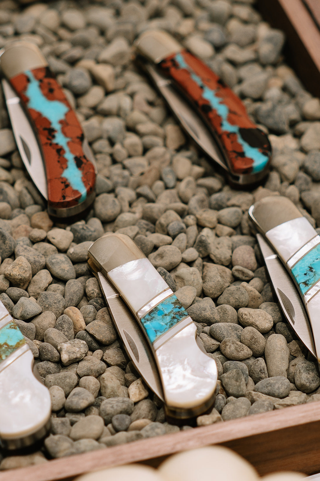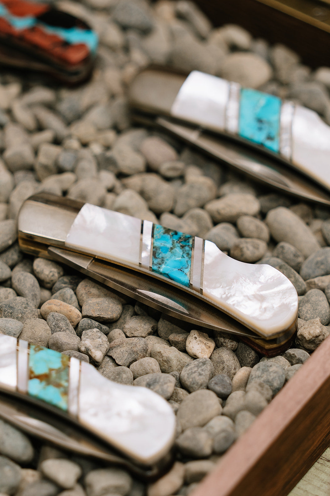 Lock Back Knife Mother of Pearl: This knife feature Turquoise from the Southwest, Azurite from Arizona, Lapis from Afghanistan, Apache Gold from Arizona & Oregon and Truestone™ Malachite. Then accented them with Mother-of-Pearl & Coral from the Philippines and Jet or Black Amber from the Southwest.Functional, beautiful and of the highest quality this closed 3" knife has a 2 1/4" blade.