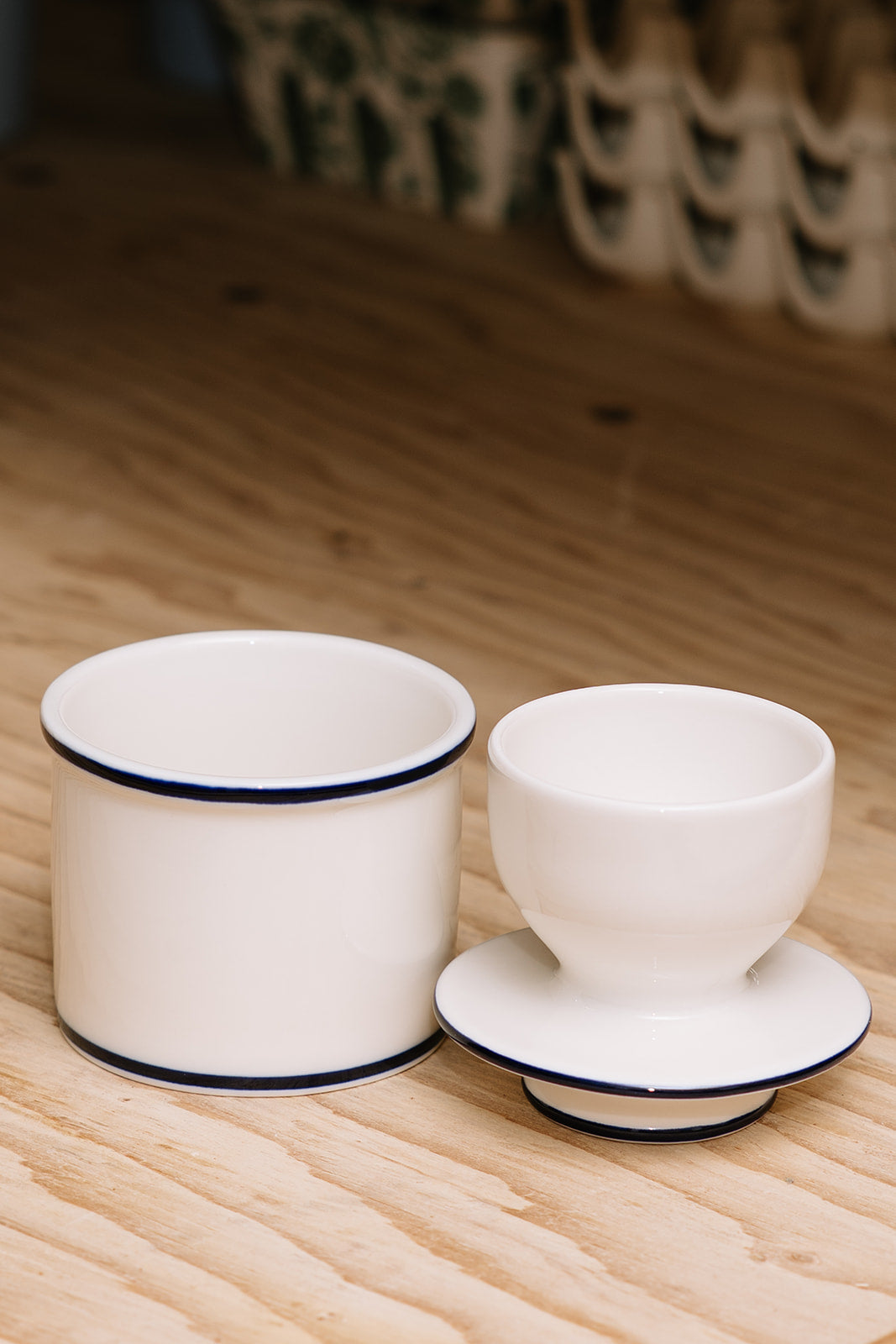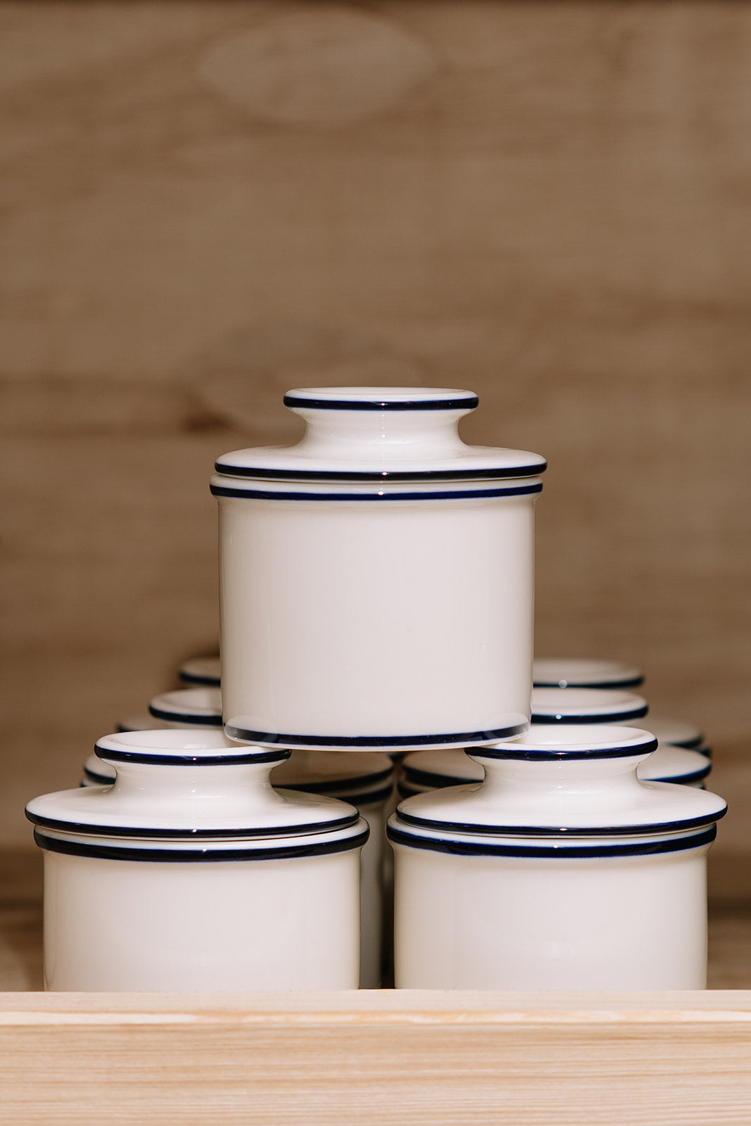 In the classic tradition of dinnerware found in Parisian bistros and brasseries, the Le Bistro Butter Bell crock is glazed in a creamy off-white color with hand painted French royal blue banding around the edges and the bottom. This stylish piece is the perfect complement to your dinnerware or tabletop settings.