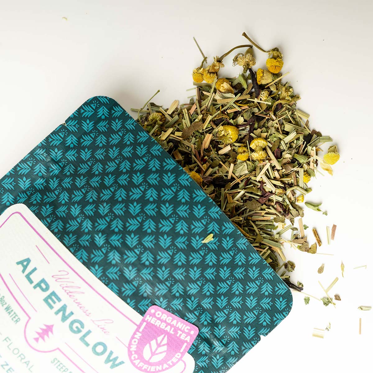 Alpenglow: A calming, yet zesty cup with a vibrant color makes for the perfect wind down to any evening. Ingredients: Lemongrass, Lemon Balm, Lemon Myrtle, Chamomile, Hibiscus.